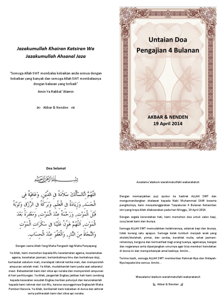 Assalamualaikum Wr Wb Dari pengajian kemarin berikut lampiran doa kehamilan 4 bulanan yang kiranya akan berguna bagi kepentingan di masa mendatang Artinya sangat bagus dan beberapa bagian dapat juga digunakan diluar konteks 4 bulanan Sayang bila tidak diabadikan dan disimpan di pustaka wordpress kita sehingga dapat digunakan bagi siapa saja yang memerlukan
